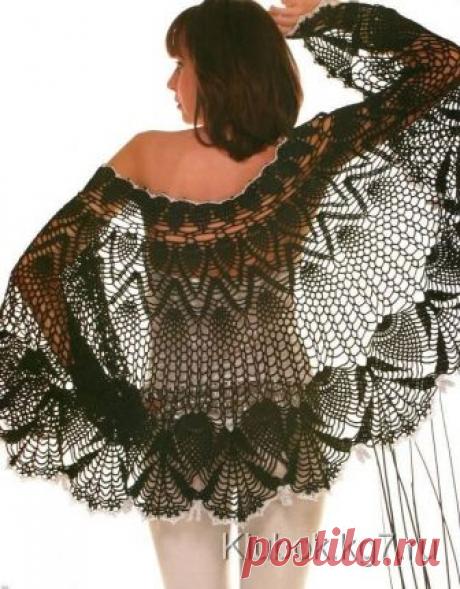 Шикарная кружевная накидка связанная крючком - это аксессуар вне времени. Дополненная обвязкой и спиральками из серебряного люрекса, она подойдет к любым нарядам: вечернему платью, брюкам и даже к пальто.