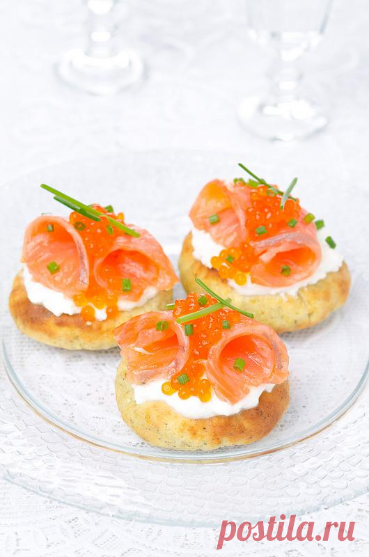 Картофельные лепешки со сливочным сыром, слабосоленым лососем и красной икрой.