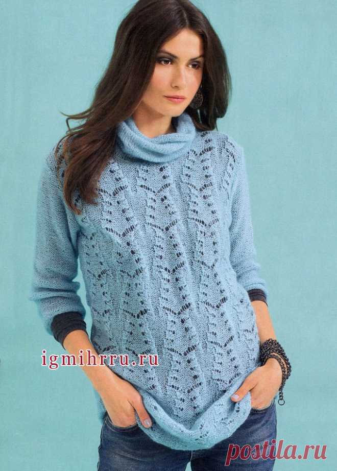 УДЛИНЕННЫЙ ГОЛУБОЙ ПУЛОВЕР С АЖУРНЫМ УЗОРОМ.