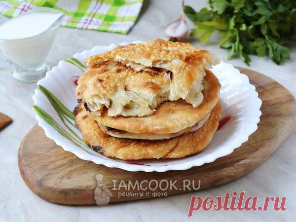 Катлама с луком на сковороде (узбекская кухня) — рецепт с фото Пресное тесто с сырой луковой начинкой сначала заворачивается в рулет, а потом - в виде рулета раскладывается на сковороде.