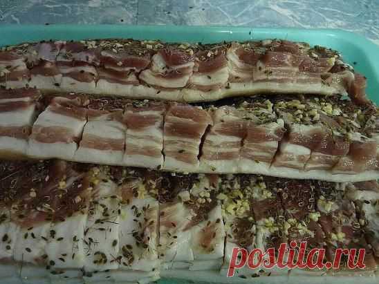 На литр воды один стакан соли и половина стакана сахара , лавр. лист ( не жалеть!), перец горошек , довести до кипения и остудить . Вот этим рассолом залить сало. Сало можно сразу пересыпать чесноком. День стоит дома потом в холодильник примерно на сутки. Потом выложить на полотенце чтоб рассол сбежал. Можете добавлять по вкусу свои приправы. Такой посол очень вкусный. Поверьте сахар не ощущается. Приятного аппетита!!!