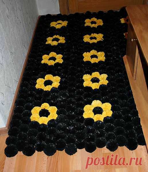 Коврик из помпонов, которые сделаны из мусорных пакетов. .
