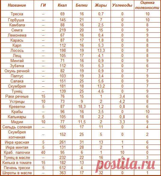 ТАБЛИЦА КАЛОРИЙНОСТИ РЫБЫ И МОРЕПРОДУКТОВ (ОЦЕНКА ПОЛЕЗНОСТИ)