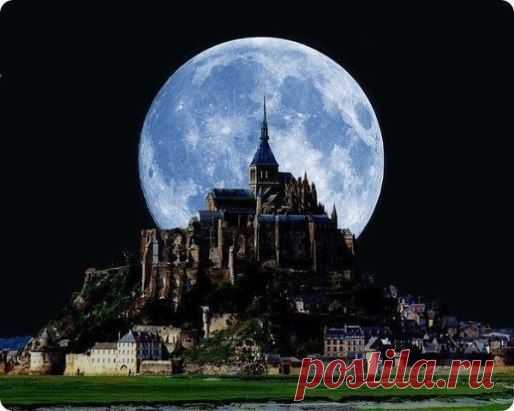 Полная луна за замком Мон-Сен-Мишель, Нормандия, Франция.