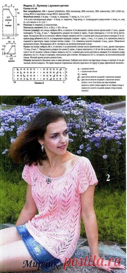 В работе использовала нитки в бобинах Агата (65%-лен, 35%-ПЭ) в 100 граммах 1135 метров, крючок 0,9мм, расход-120грамм. Схему нашла в интернете, узор оказался интересным и довольно простым. Вязание начинала снизу и вязала по кругу до проймы, дальше перед и спинку вязала отдельно, сшила по плечевым швам. Края изделия обвязаны столбиками без накида.