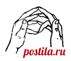 Методика исполнения: мизинец левой руки прикасается к сердечному (безымянному) пальцу правой руки; мизинец правой руки касается сердечного пальца левой руки. Одновременно соединяется средний палец правой руки с указательным пальцем левой руки, а средний палец левой руки с указательным пальцем правой руки. Большие пальцы расставлены.