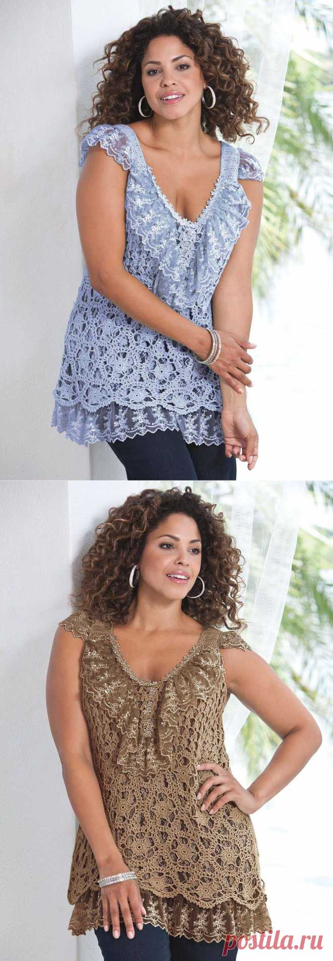 Для нас, "роскошных": шикарный топ-туника крючком с кружевом.