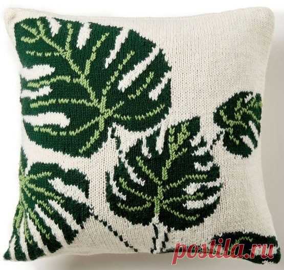 Подушка спицами в технике жаккарда "Лист монстеры"