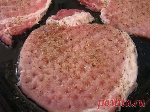 1. Нарезанное кусочками мясо отбиваем через пленку и выкладываем на смазанный маслом противень. Добавляем соль и специи