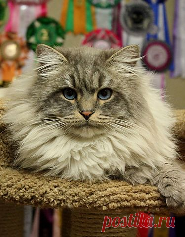 Невский маскарадный кот Белый Тигр, или просто Санек. Он достиг титула Европейский Чемпион, завоевал множество наград на выставках.