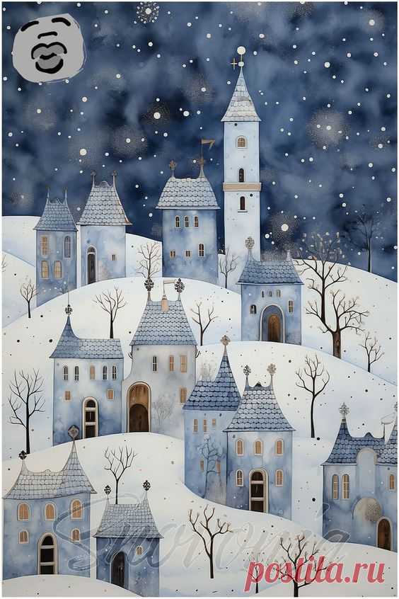 This may contain: a winter scene with houses and trees in the snow, painted on canvas by hand