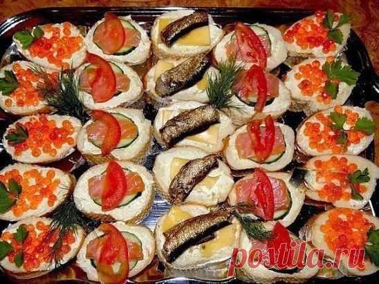 БУТЕРБРОДЫ ЗАКУСОЧНЫЕ 1)майонез,чеснок,сыр,шпрот 2)масло или сыр,огурец,форель,помидор 3)масло и икра