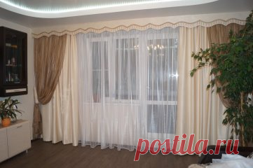 Отрез ткани по периметру обрабатывается косой бейкой, наверху отступив 5см пристрачивается полоска ткани (кулиска), чтоб штору одеть прям на трубу карниза. и по линии (см. схему) пристрачивается шторная лента. Шторку одела на карниз, повесила и уже на месте регулировала сборку шторной ленты.