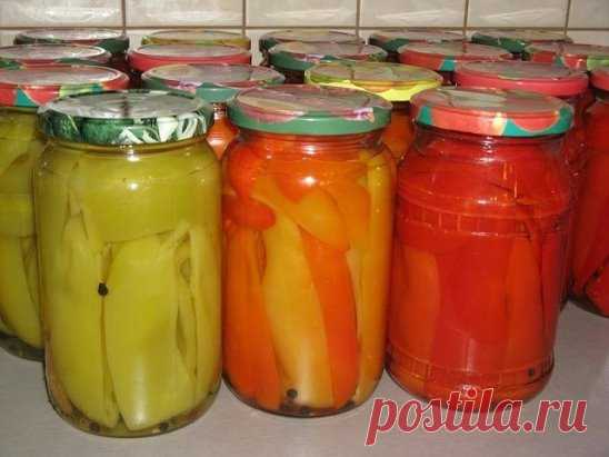 Перец помыть, удалить плодоножки и семена, разрезать на четвертинки. Приготовить горячий маринад. Выложить перец в маринад, довести до кипения на среднем огне, варить 5 минут. Переложить перец в стерилизованные банки. Маринад довести до кипения. Залить банки маринадом. Закатать, перевер