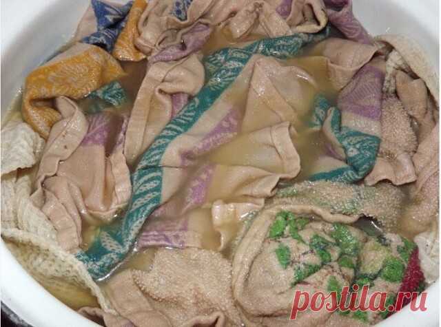 В этот горячий раствор помещаем наши СУХИЕ грязные полотенца и оставляем до полного остывания. Остается только прополоскать.