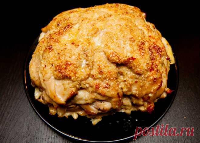 3. В смазанную маслом форму сложить яблоки и залить тестом, поставить в духовку.