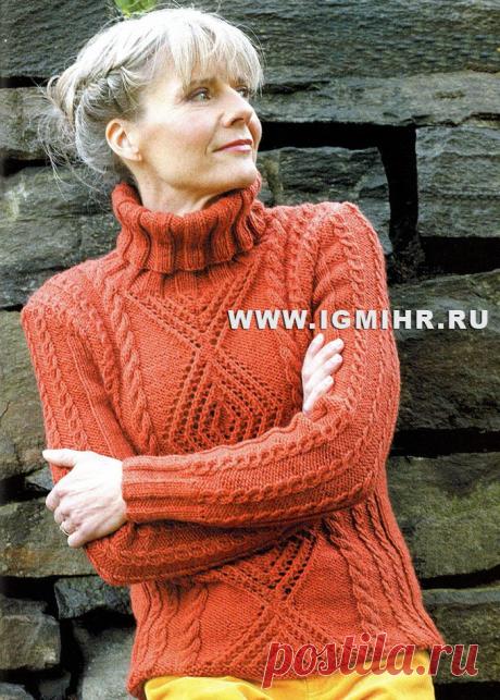 Терракотовый свитер с рельефными узорами, от финских дизайнеров. Спицы