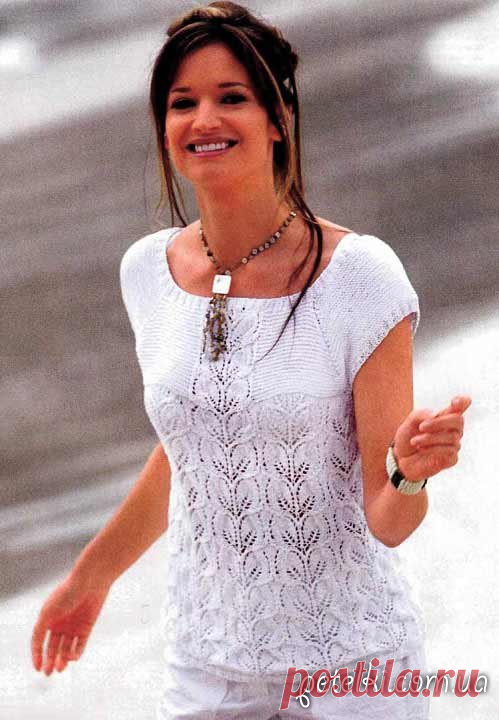 Ажурный топ спицами. Описание вязания, схемы Представляем вашему вниманию красивый нежный ажурный топ на лето, связанный спицами узором из парных листочков. Размеры: 36 (38/40) Вам потребуется: 350 г белой пряжи Baumwoll-Cable (100% хлопка, 135 м/50 г); спицы № 3. Резинка: попеременно 2 лиц., 2 изн. Платочная