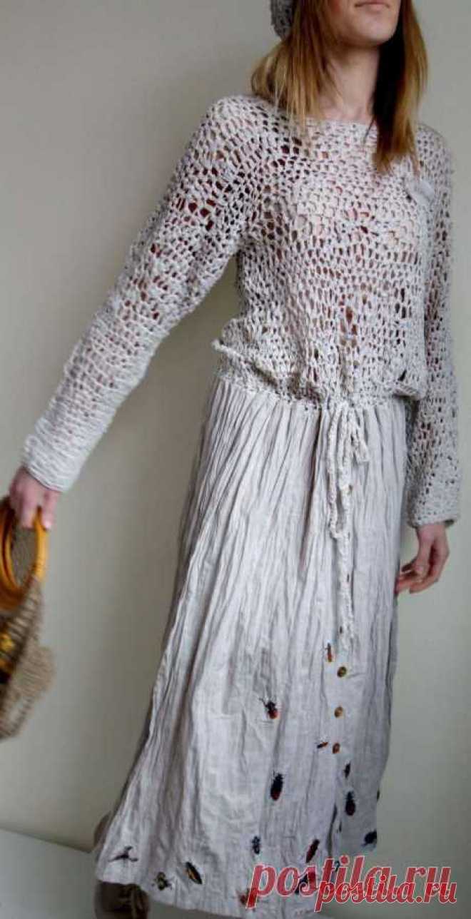 Теплая и одновременно красивая накидка связана спицами и крючком. Большая часть полотна накидки связана простой, широкой резинкой. Накидка представляет собой простой прямоугольник, но благодаря узору выглядит очень эффектно. Нижний край накидки обвязан ажурной каймой крючком. Накидку лучше застегивать на декоративную брошь, тогда ей можно придавать различную форму. Накидка красиво отгибается около шеи. В такой накидке вам будет тепло и комфортно.