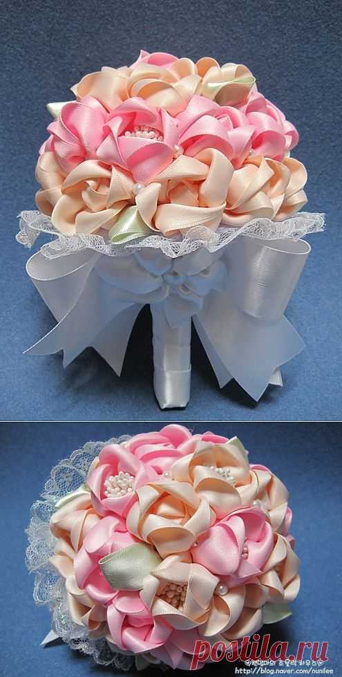 Такой букет не завянет и не испортится. Очень нежный свадебный букет из атласных лент.