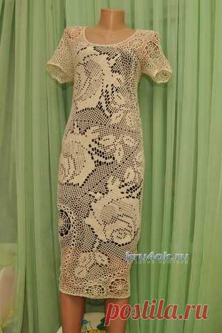 Светло-бежевое платье «Розы». Филейное вязание крючком