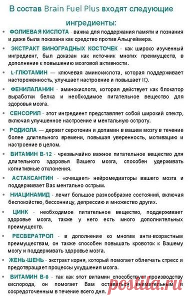 13 составляющих компонентов Brain Fuel PLUS ■ Астаксантин - ■ Витамин В-6 - ■ Витамин В-12 - ■ Женьшень - ■ Ресвератрол - ■ Родиола розовая - ■ Сенсорил - ■ L-Глютамин - ■ Ниацинамид - ■ Фенилаланин - ■ Фолиевая кислота - ■ Цинк - ■ Экстракт виноградных косточек -