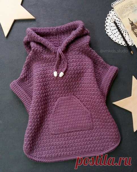 Крестообразным набором набрать 50 петель и вязать резинкой 2 на 2 30 рядов ( перед ) , петли отложить . Затем также связать на 50 петлях вторую деталь , но уже чуть длиннее 40 рядов ( спинка ) , далее обе детали замкнуть в круг и вязать по кругу 30 рядов . На передней половинке закрываем средние 18 петель и продолжаем вязание , закрывая с каждой стороны в каждом вто...