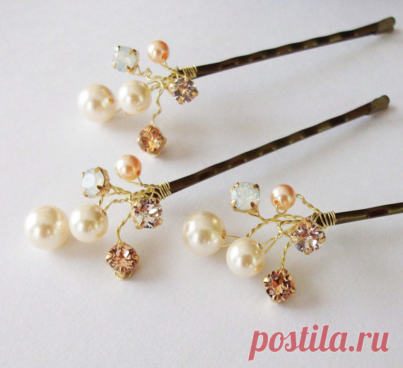 Wedding Hair Accessories,Choice of White or Cream Pearls and Swarovski Elements, Pearl Hair Clips, Peach and Cream Weddings, Hair Piece Peach and Cream Blend Wedding Hair Pins Highly versatile and ready for a little hair creativity, our rhinestone, crystal and pearl berry sprig bobby pins will certainly give you the versatility needed for that special day. Perfect for the bridal party members as well. This listing is for a set of Three (3). Need more? There is a quantity...