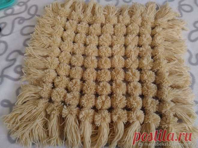 Создаем коврик-накидку на табурет из помпонов Сегодня хочу показать вам мастер-класс по изготовлению коврика-накидки на табурет размером 40х40 см.У каждого своя техника плетения, вязки таких ковриков.