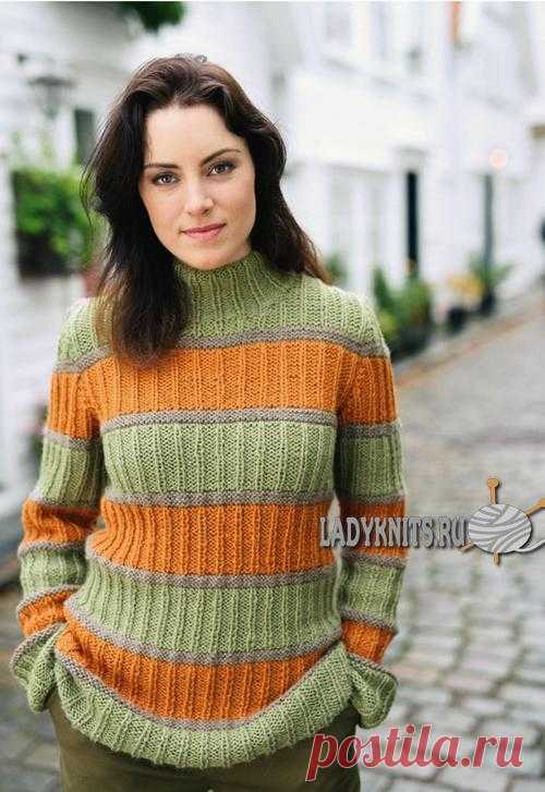Вязаный спицами полосатый женский свитер. Простое вязание.