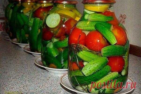 Нашинковать капусту, натереть морковь, нарезать мелко болг. перец, измельчить чеснок. Все смешать. В стерилизованные банки 3-х литровые. На дно, лавр. лист, перец душ. гор., 2 зонтика укропа. Укладываем помидоры, пересыпая каждый слой нашинкованными овощами. Сверху 3 табл. аспирина и залить рассолом.