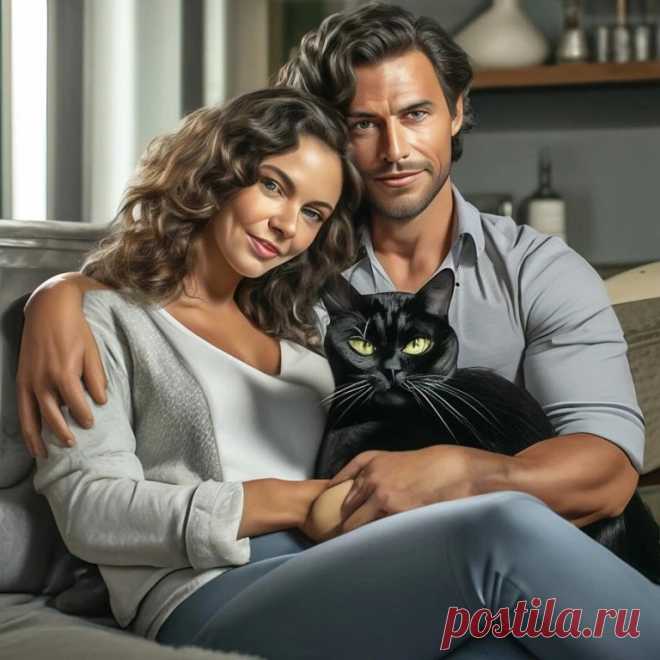 гиперреалистичный красивый мужчина и красивая шатенка с кудрями обнимаются,сидят на диване, уютно, комфортно, тёмные волосы с серыми глазами,чёрный британец - кот на коленях, на кухне, домашняя обстановка, профессиональное фото, высокая детализация, 8k