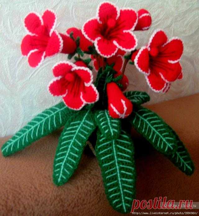 Центральная часть связана с бисером. Нитки — YarnArt Tulip (микрофибра). Лепестки — столбики без накида, листья — тунисские столбики. По периметру проложен проволочный каркас. Не знаю, зачем я обвязала чашелистик пико; изнанка всё равно никому не видна