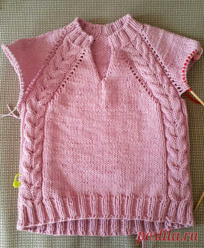 Спинка: набрать на спицы 105 петель и вязать платочной вязкой, в высоту выполнить 6 рядов. Затем вязать осн...