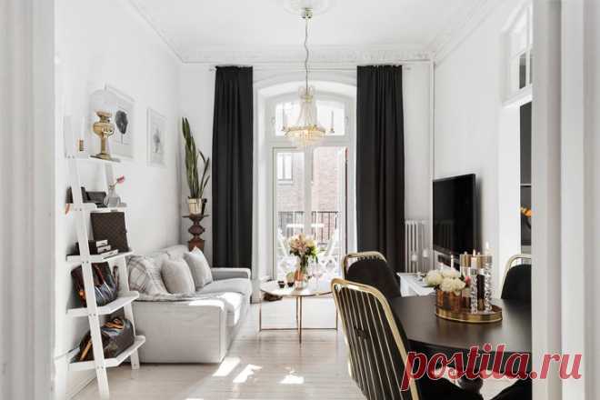 Черно-белый интерьер квартиры в Гётеборге, который точно понравится женщинам. Все достаточно лаконично в квартире, а наличие золотых деталей добавляет шика