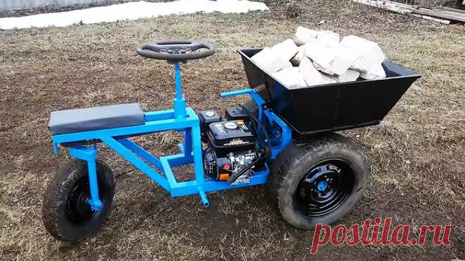 Самодельная бензиновая тачка с простым управлением Кране полезная тачка грузоподъемностью до 200 кг незаменимая вещь для транспортировки строительных и других материалов на небольшие расстояния. Малогабаритная, маневренная и легко управляемая — такую точно не купить на нашем рынке.