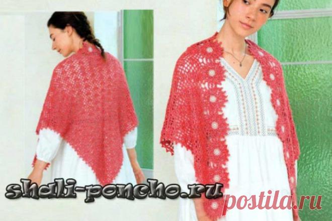 Шаль с мотивами по верхней стороне Ажурная шаль, украшенная полосой круглых мотивов по верхнему краю, связана крючком № 3 из 240 г пряжи (63% вискоза, 37% шерсть; длина 98 м/30 г).