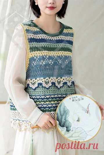 Полосатая безрукавка с миксом узоров и красивыми оборками. Крючком. Схемы. / Обсуждение на LiveInternet - Российский Сервис Онлайн-Дневников