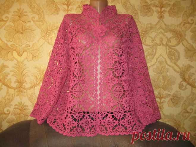 Шазюбль из квадратных ажурных мотивов. Описание, схемы Очень нежный шазюбль (летнее пальто), связанный из красивых квадратных моотивов. Автор - Валентина Нестерова Вам потребуется: 300г хлопка (50г х 282м), 350г микрофибры (50г х 250м); крючок N1,5; 5 перламутровых пуговиц под «жемчуг». РАЗМЕР