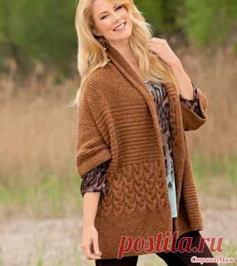Этот джемпер вяжется очень просто. Сначала нужно связать две широких ажурных полосы (одну для переда. другую для спинки) более темной пряжей. (Кстати, цветовое сочетание в этой кофточке потрясающее!)