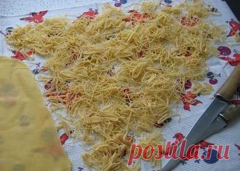 Лапша домашняя - самый простой рецепт - Эфария Состав: — мука – 1 стакан — яйцо – 3 шт. — соль – по вкусу Муку просеять и насыпать горкой. Сверху сделать углубление. Посолить. Яйца взбить и влить в муку. Тщательно перемешать. Оставить на 30 минут. Тесто раскатать пластом толщиной 2-3 мм. Немного дать подсохнуть и нарезать тонкой лапшой. источник
