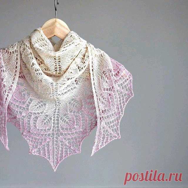 Шаль из Alize Bella Batik Design Шаль имеет треугольную форму, вяжется сверху вниз. Начало вязания — середина верхней кромки, прибавления располагаются вдоль центральной петли и по краям полотна. Узор выполняется в лицевых рядах, в изнаночных рядах все петли, в том числе накиды, вяжутся изнаночными.Уровень...