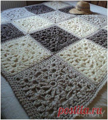 Вязаный плед из квадратных мотивов Вязаный плед из квадратных мотивовЭтот плед состоит из квадратных мотивов разных цветов, связанных по схеме ниже.По схеме нужно связать необходимое количество квадратных мотивов в зависимости от размера пледа. Затем все мотивы сшить/связать между собой пряжей основного цвета. Готовый плед