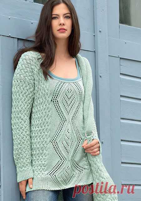 Удлиненный пуловер и сумка плетеным узором спицами – схемы с описанием вязания - Пошивчик одежды Потрясающий модный пуловер, который сведет с ума каждую модницу. Завораживающий мятный цвет, модный плетеный узор, вертикальная линия из ажурных ромбов и в