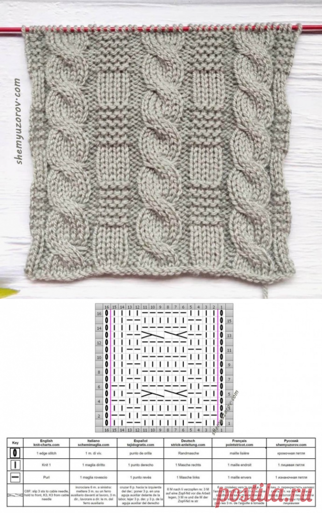 Фактурный узор спицами Интересный узор, который меняется в зависимости от выбора цвета и толщины пряжи. При этом 3D-эффект проявляется в любом случаеОПИСАНИЕРаппорт 18 петель + 1 петля для симметрииПовторять с 1-го по 36-й рядНа схеме приведены только лицевые ряды, в изнаночных все петли - по рисунку, накиды -...