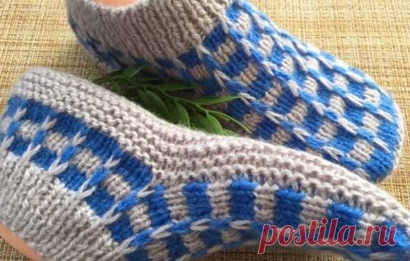 Вязаные тапочки с узором ЖАККАРД на 2-х спицах. Вяжем на размер 36-38