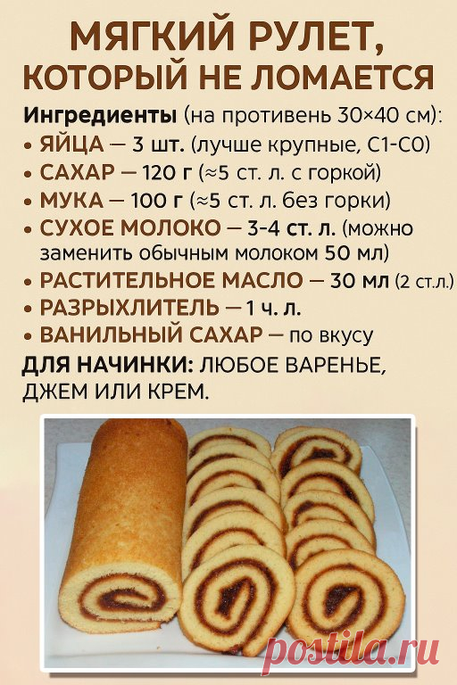 Сегодня я делюсь рецептом тонкого бисквитного рулета, который при скручивании не трескается.