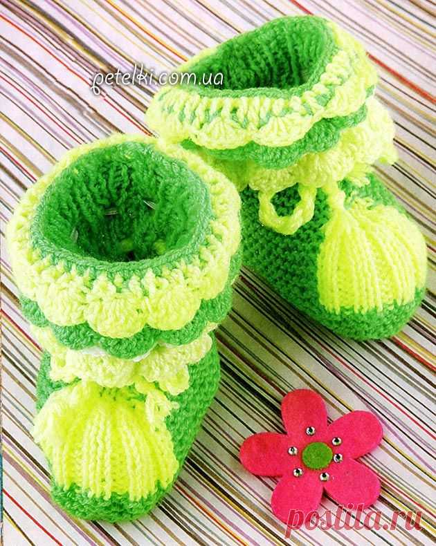 Пинетки-сапожки с оборками. Описание вязания. Спицы + крючок