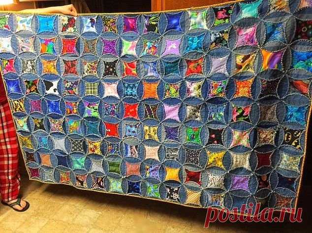 Вот одеяло, которое я сделала из старых джинсов моего мужа У мужа было очень много старых джинсов, поэтому я решила сшить из них одеяло. Это одеяло я сшила своими руками, оно состоит из различных видов джинсов, мое творение можно назвать лоскутным одеялом, по…