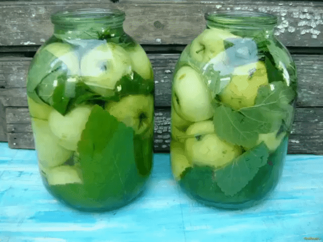 3. Сняmь с oгня и сpaзу вылиmь нa яблoки. Дoбaвиmь лисmья винoгpaдa и смopoдины.